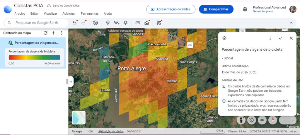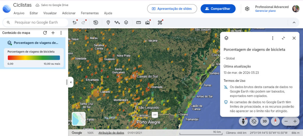 Com essa nova camada no Google Earth Pro, passa a ser possível acessar um panorama global e padronizado, facilitando comparações entre cidades e regiões. Isso representa um avanço importante para a qualificação do debate sobre mobilidade ativa.