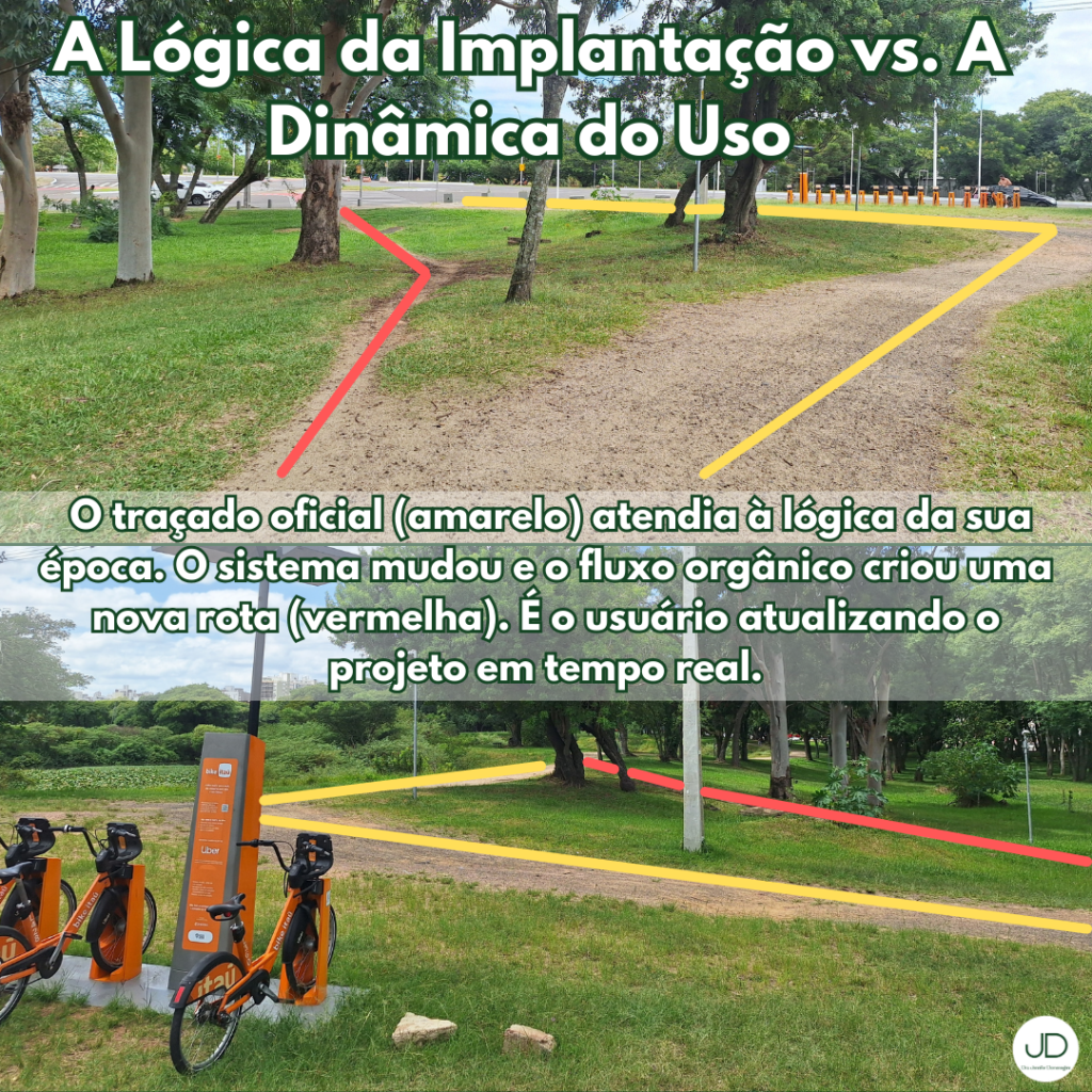 Nem todo caminho de desejo é consequência de mudança posterior. Alguns são evidência de que o comportamento real não foi plenamente incorporado ao desenho inicial.